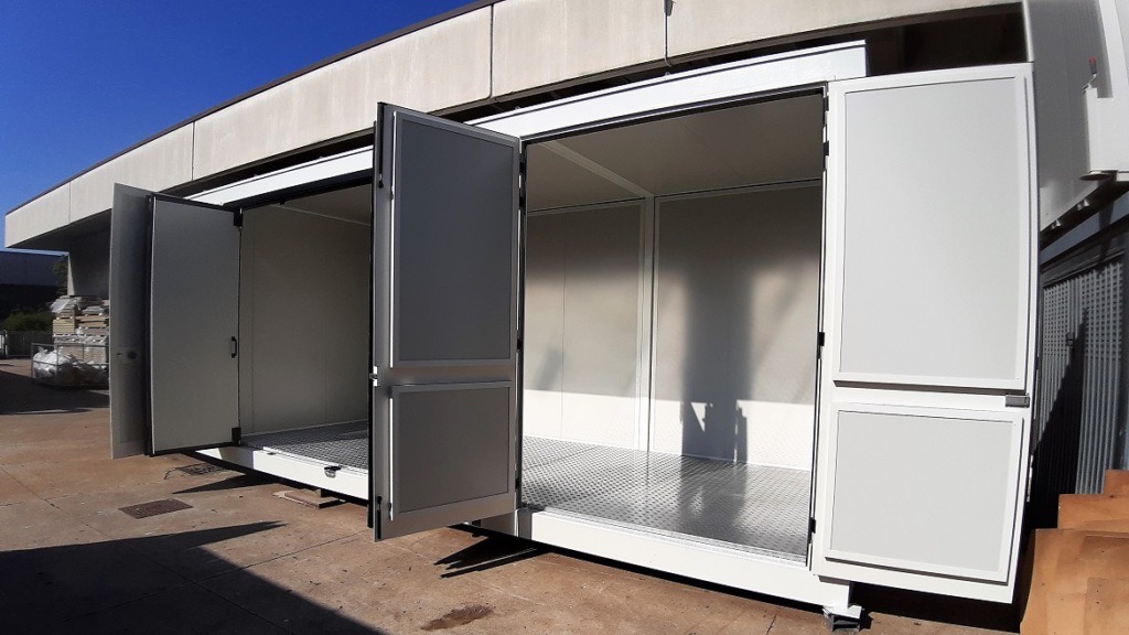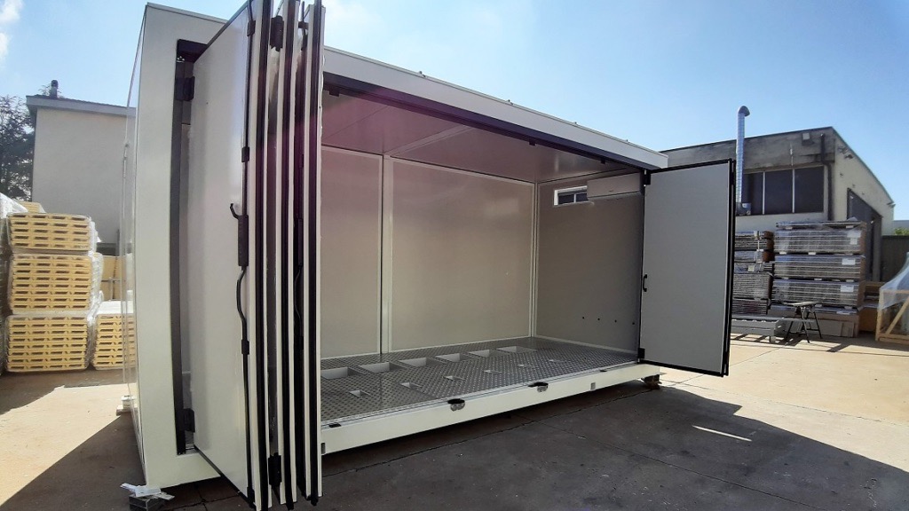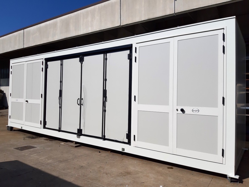 Serramento FRONTALE a impacchettamento su due lati, perconsentire la massima apertura frontale, per le operazioni dimontaggio e manutenzione macchine.