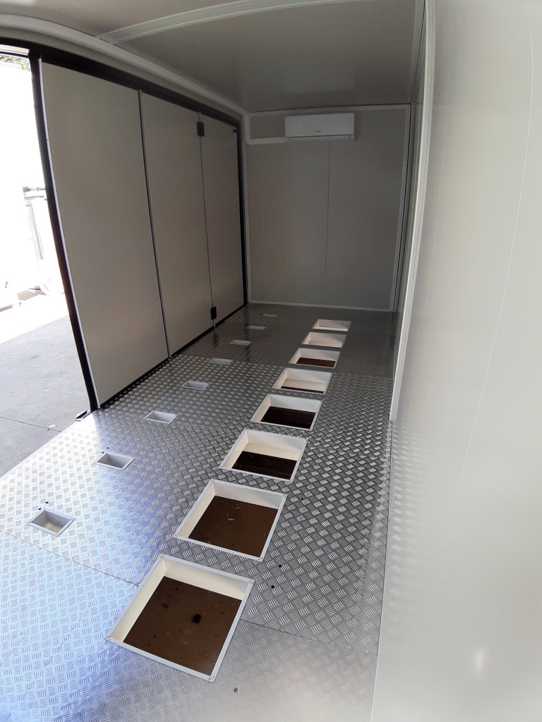Pavimento alta portanza, rivestito con Lamiera di AlluminioMandorlata, predisposto con forometrie per passaggio cavi.