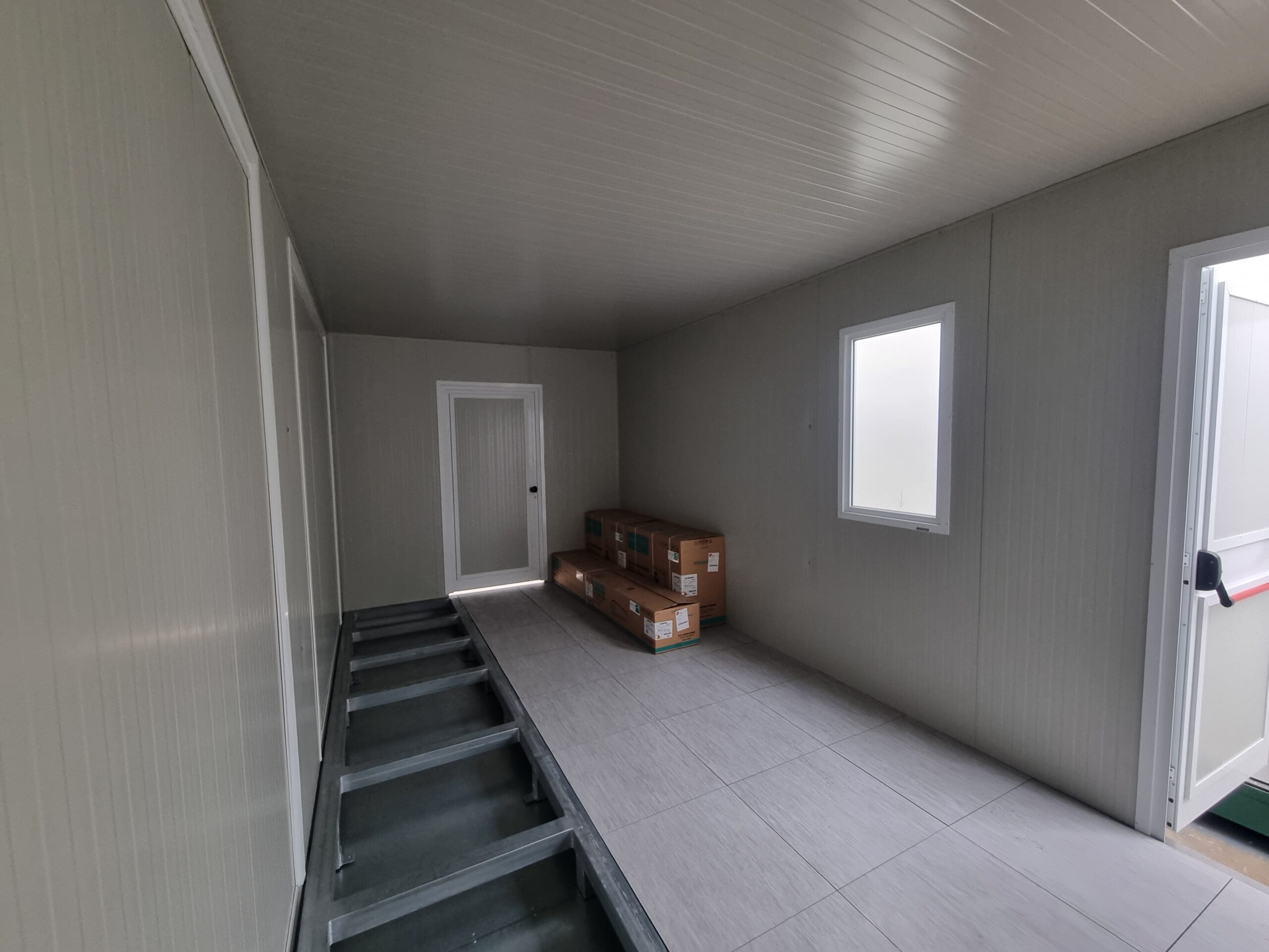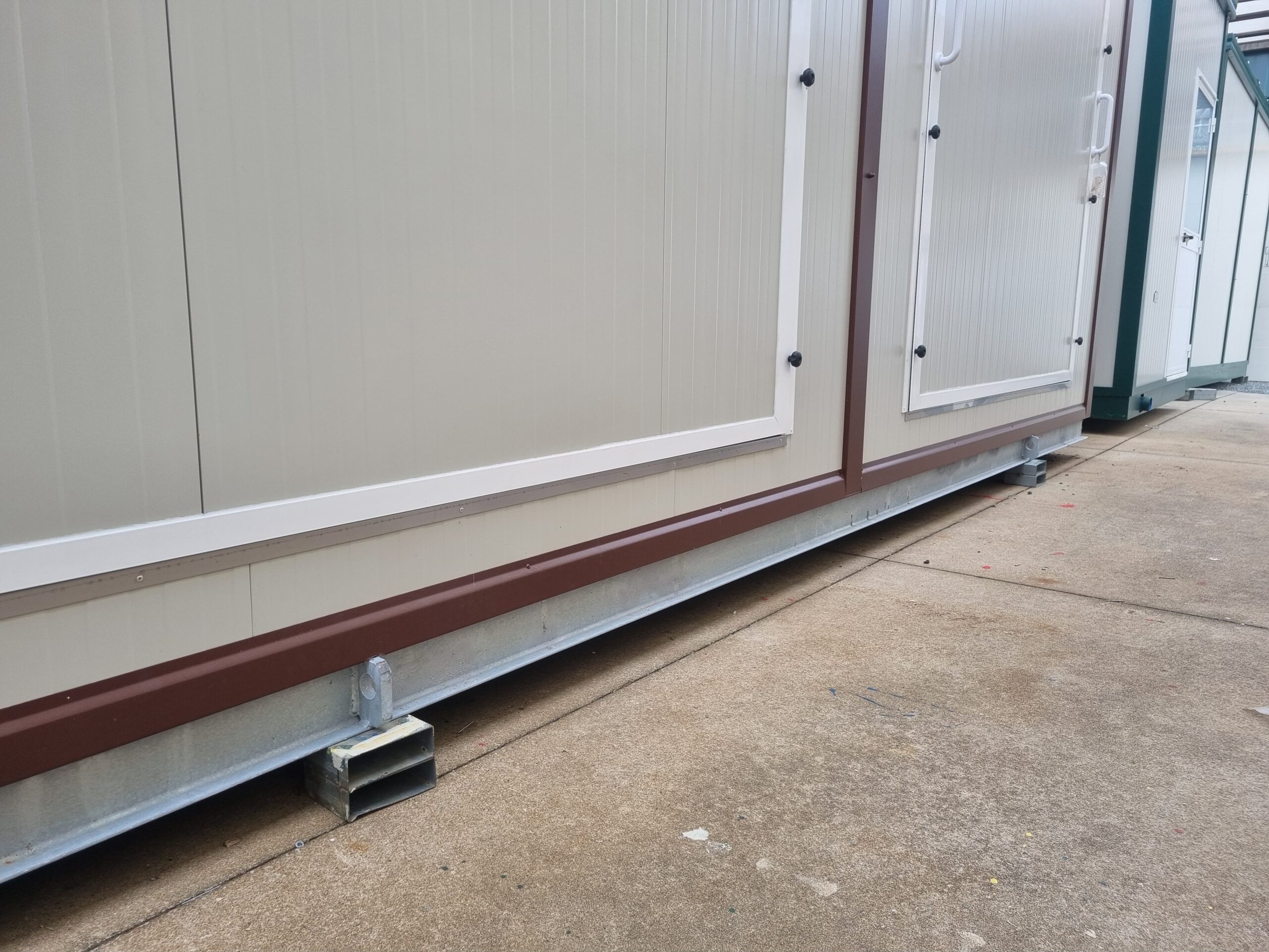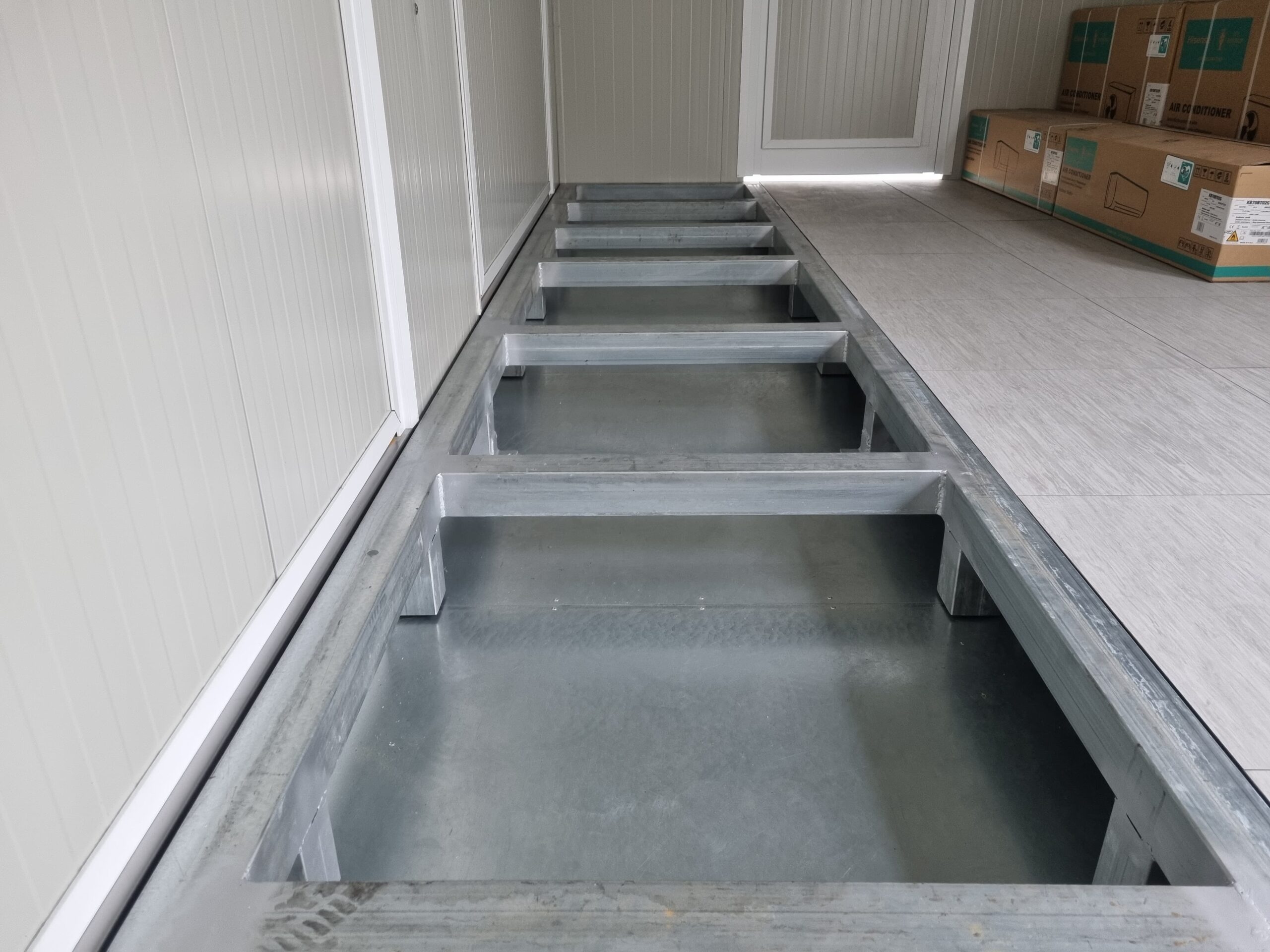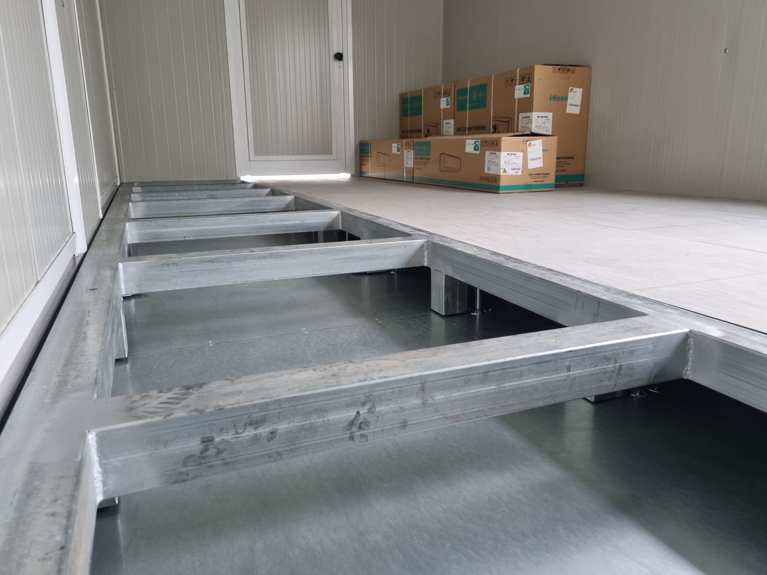 Basamento alta portanza con basamento in travi IPE120 saldate in continuo e zincate a caldo, rivestite con lamiera di alluminio mandorlata, rivestita con Pavimento galleggiante, con struttura h = 20 cm e mattonelle 60 x 60 cm.