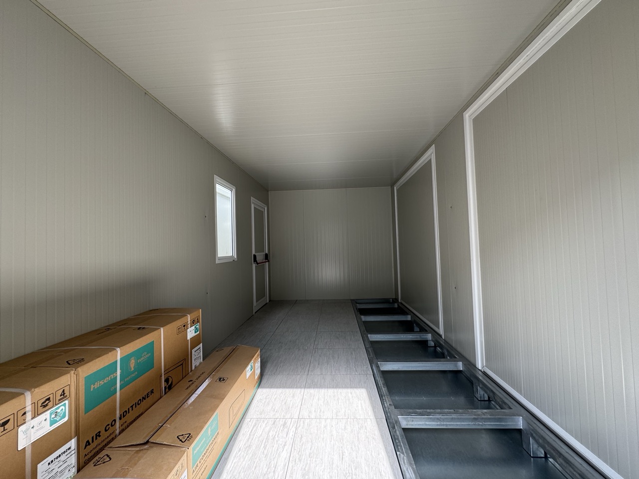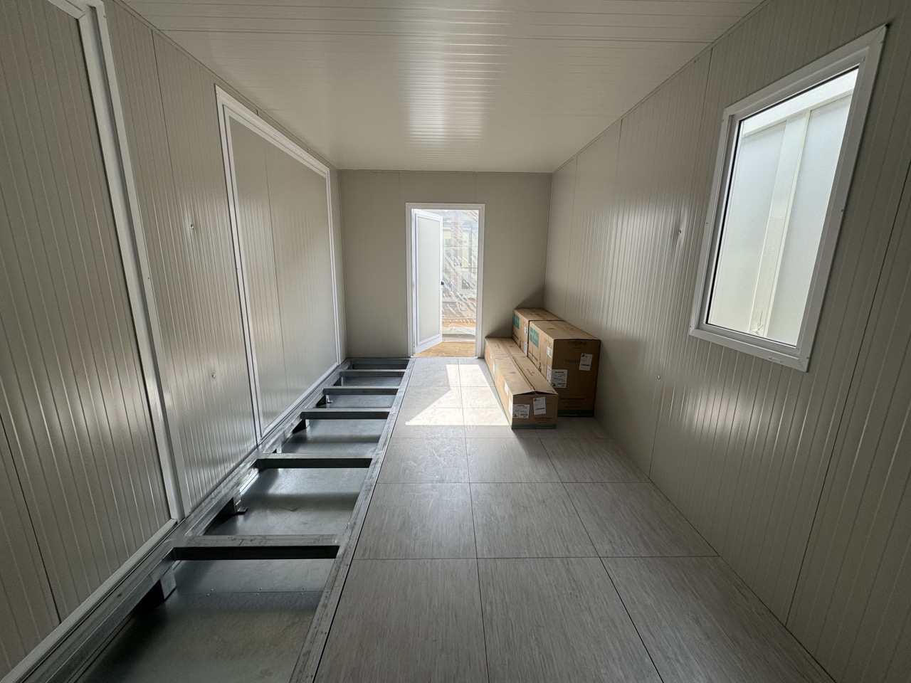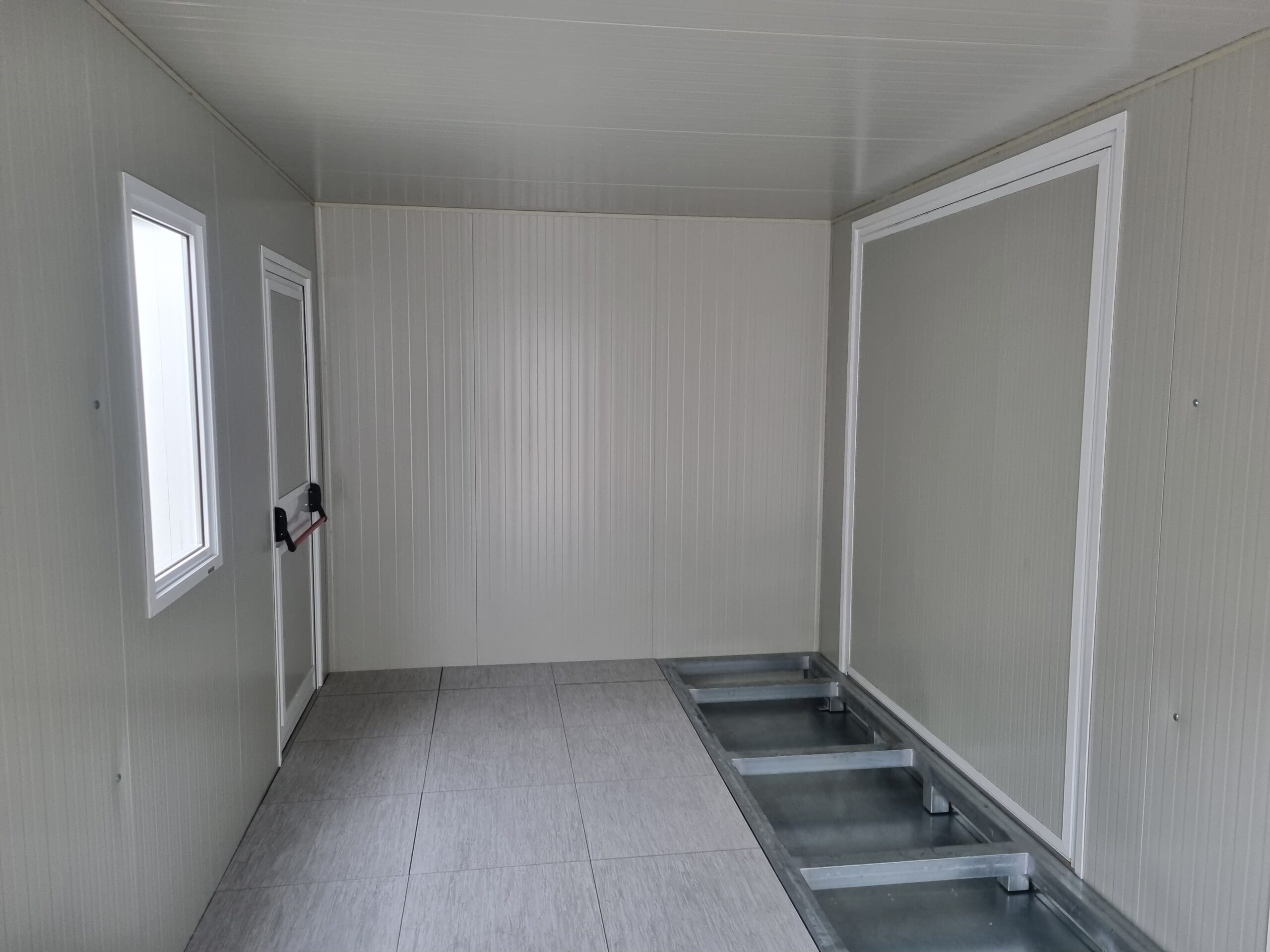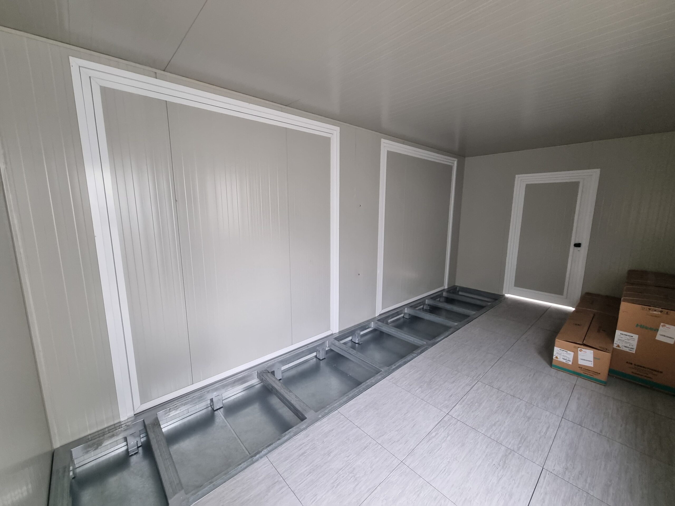 Basamento alta portanza con basamento in travi IPE120 saldate in continuo e zincate a caldo, rivestite con lamiera di alluminio mandorlata, rivestita con Pavimento galleggiante, con struttura h = 20 cm e mattonelle 60 x 60 cm.