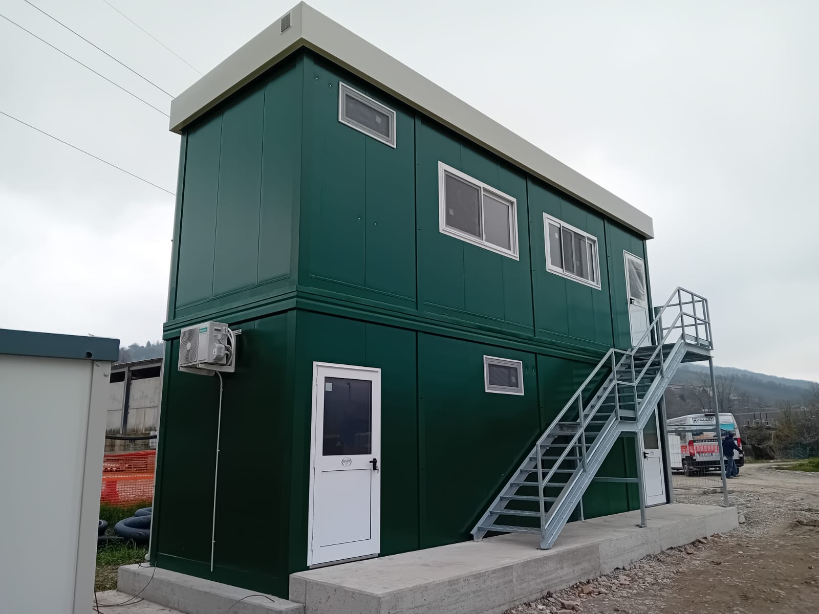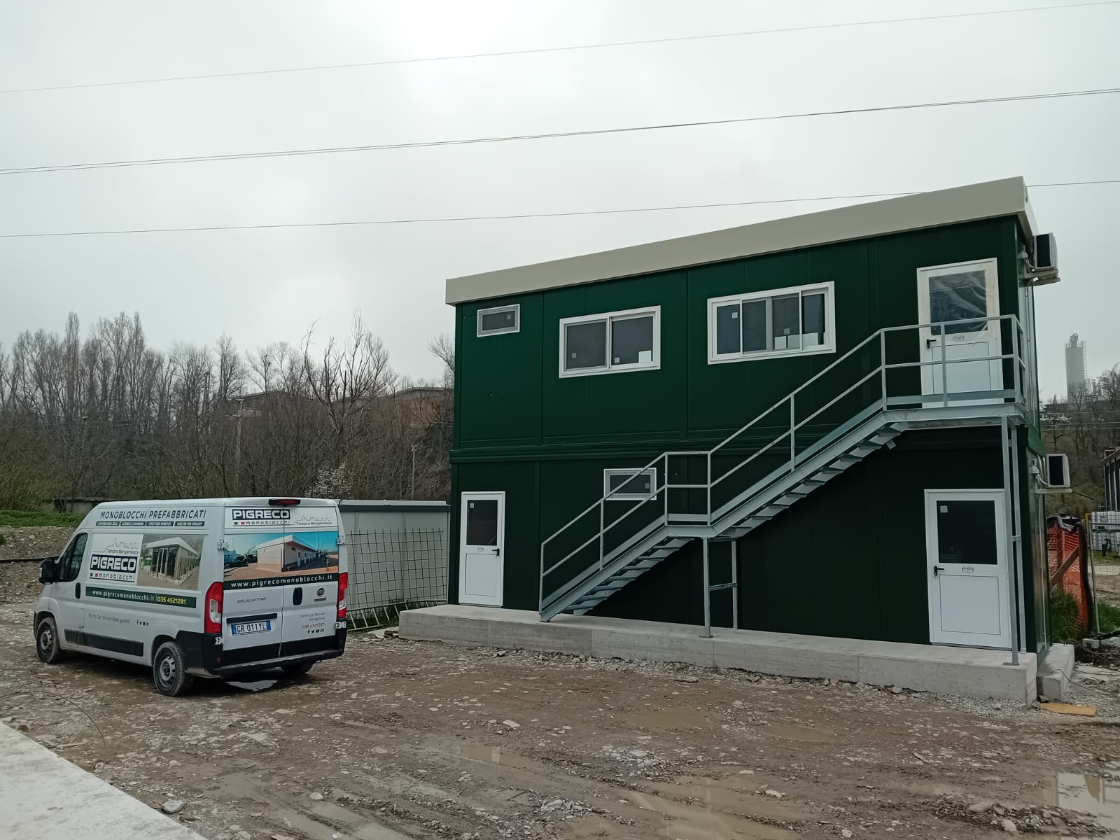 Basamento alta portanza con struttura in tubolare, rivestito con lamiera grecata, rivestito con Pannello Parete sp.100 mm – Poliuretano, rivestito con legno IDRO V100 sp.18 mm, rivestito con: Pavimento Vinilico Modulare Colorazione LIGHT GREY.
