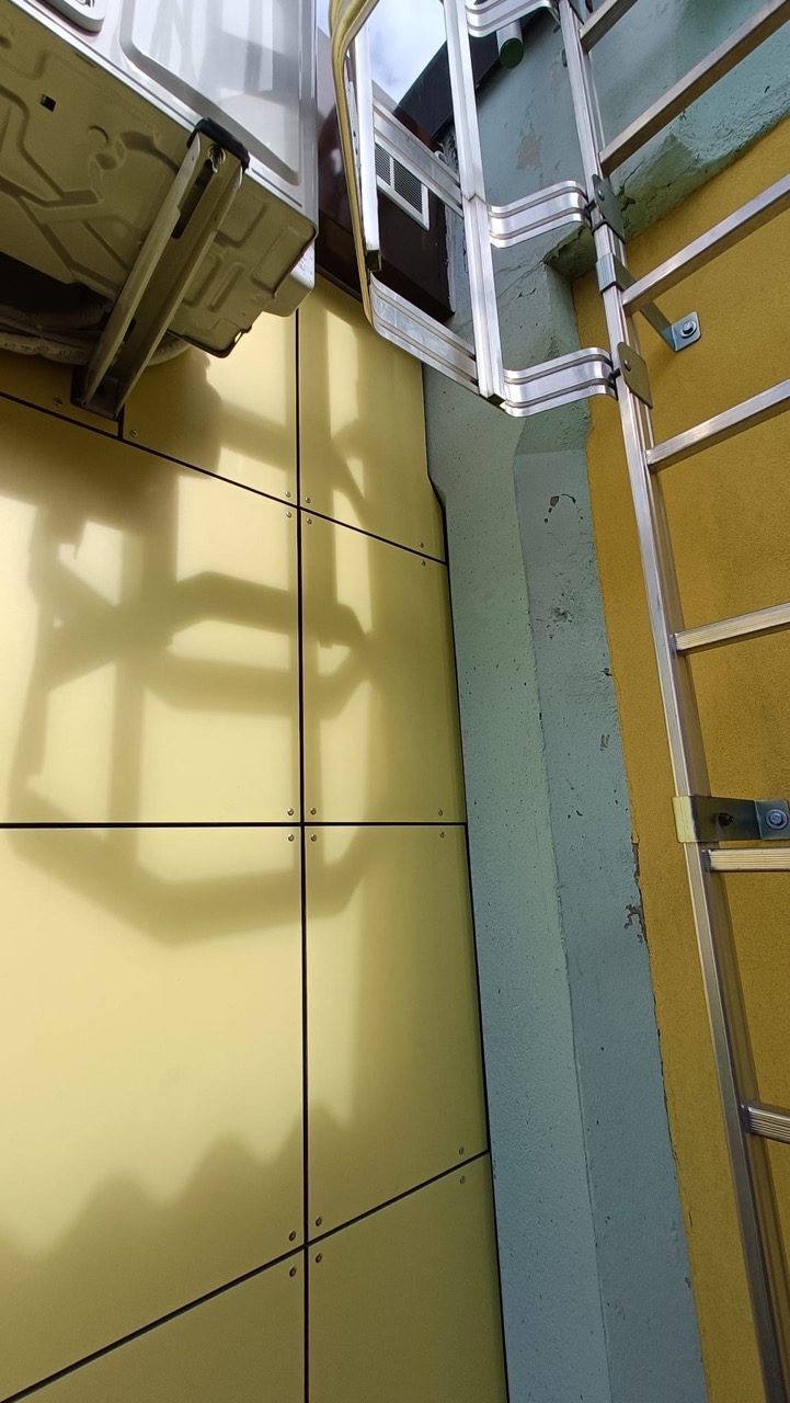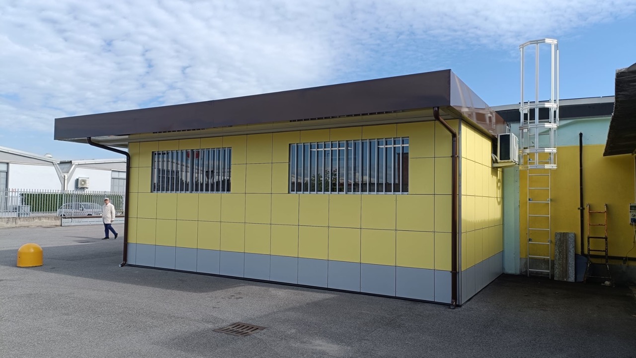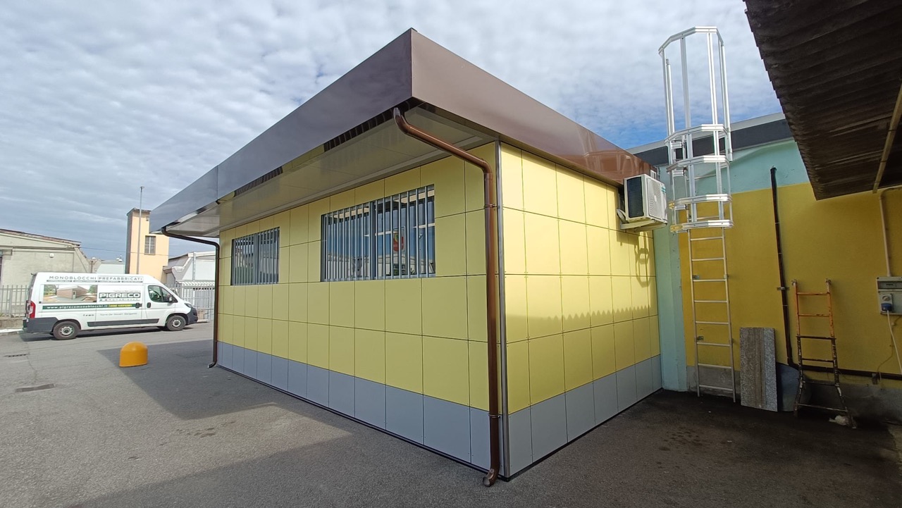 N.1 Rivestimento esterno in HPL, su 1 lato lungo e 2 lati corti con fascia bassa simil RAL 9006 e restante parte simil RAL 1016.