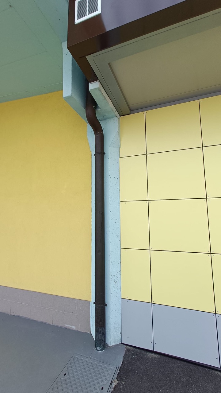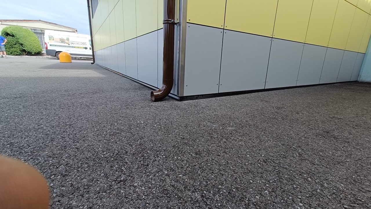 Fascione di gronda perimetrale RAL 8028, completo di pluviali di scarico a terra. Dimensioni 920 x 510 cm.