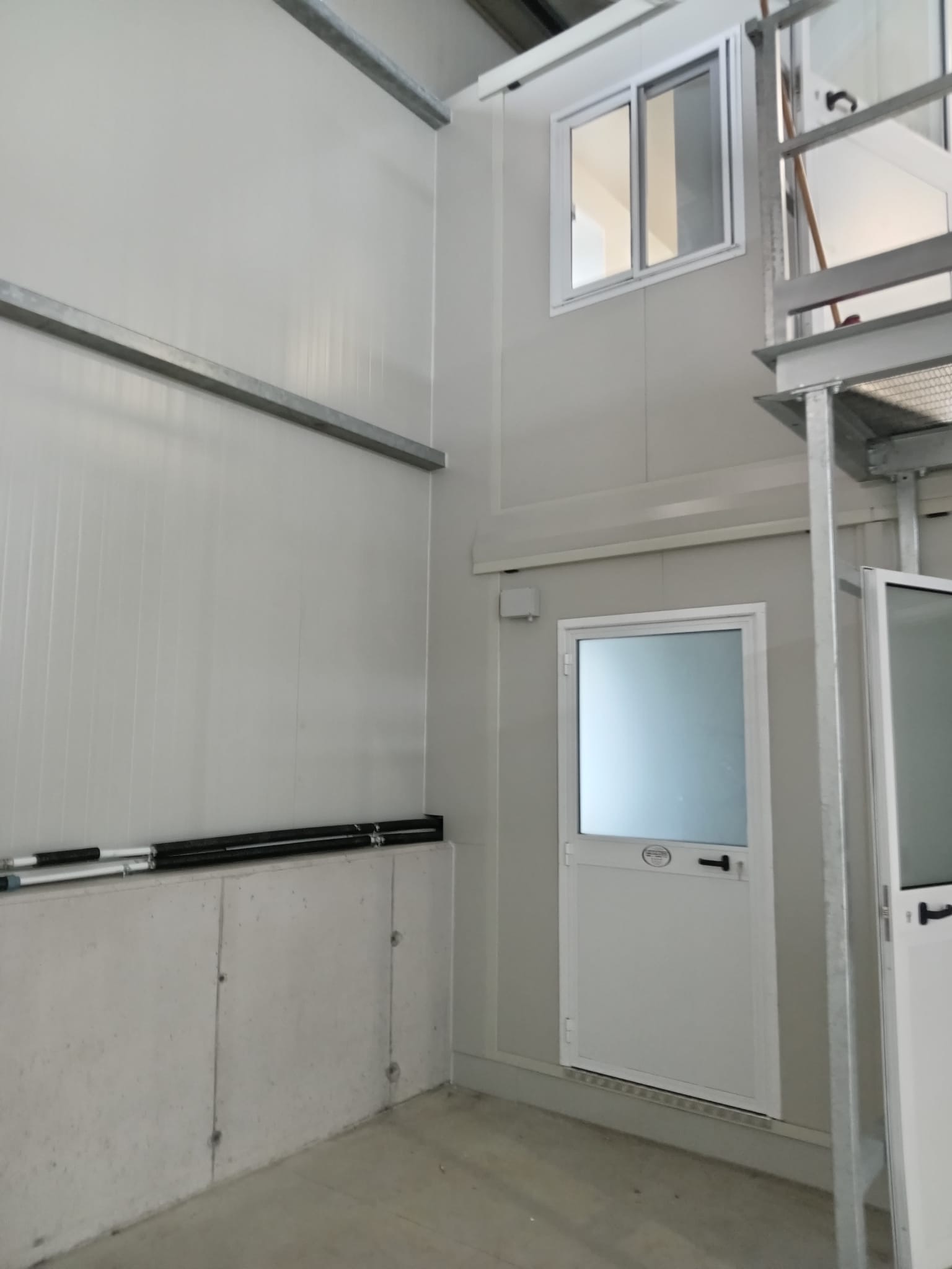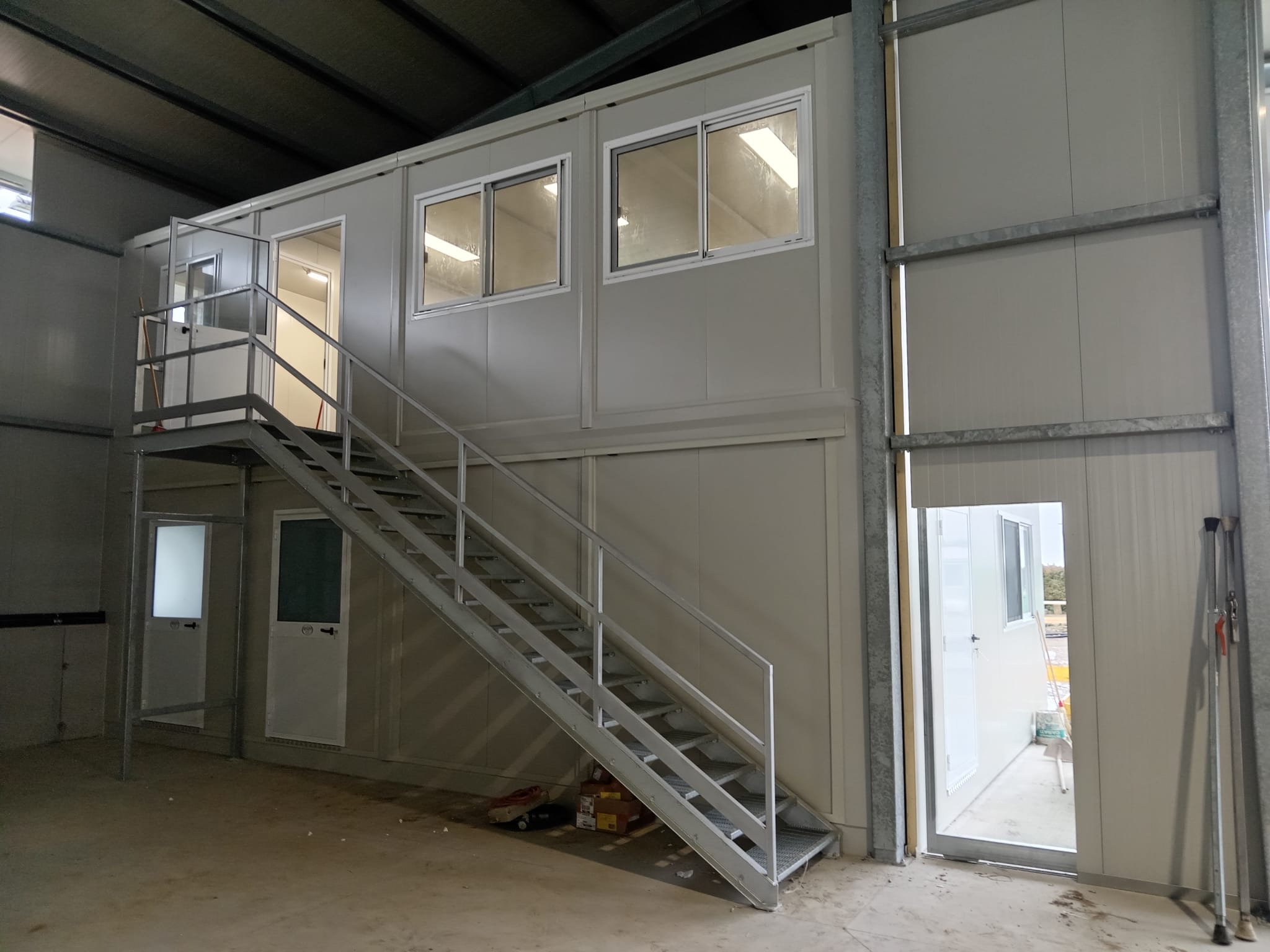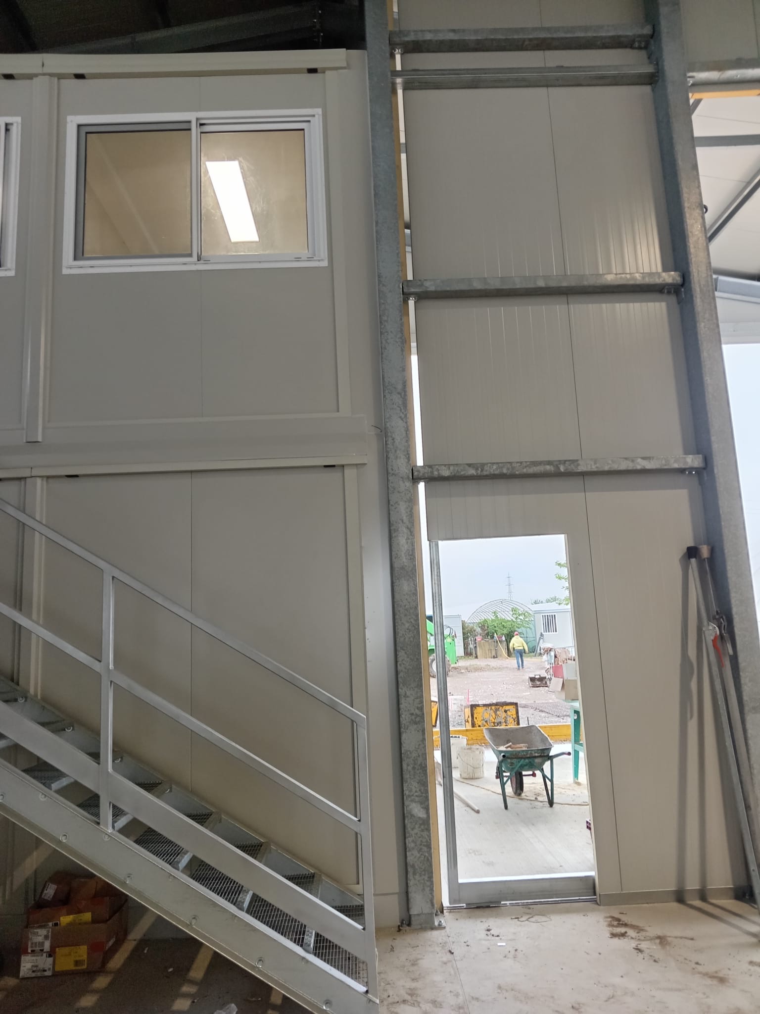 N.1 Scala di accesso a due rampe, completa di ballatoio, zincata a caldo, con struttura in tubolare e gradini grigliati, completa di parapetto.