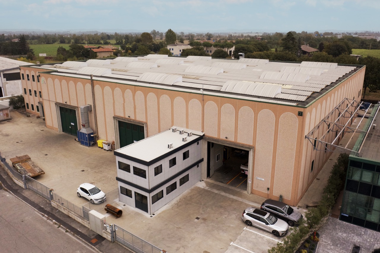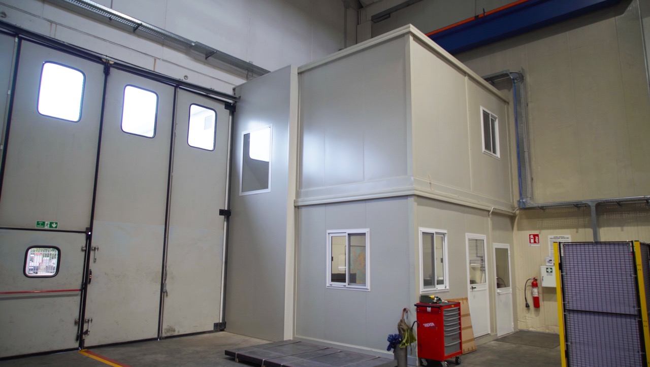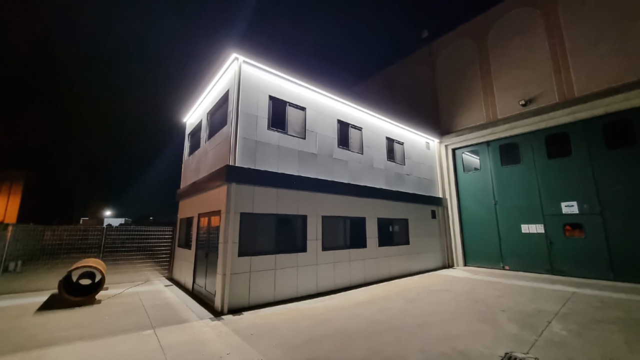 Basamento alta portanza con struttura in tubolare, rivestito con lamiera grecata, rivestito con Pannello parete sp.100 mm – Poliuretano, rivestito con legno IDRO V100 sp.18 mm, rivestito con: