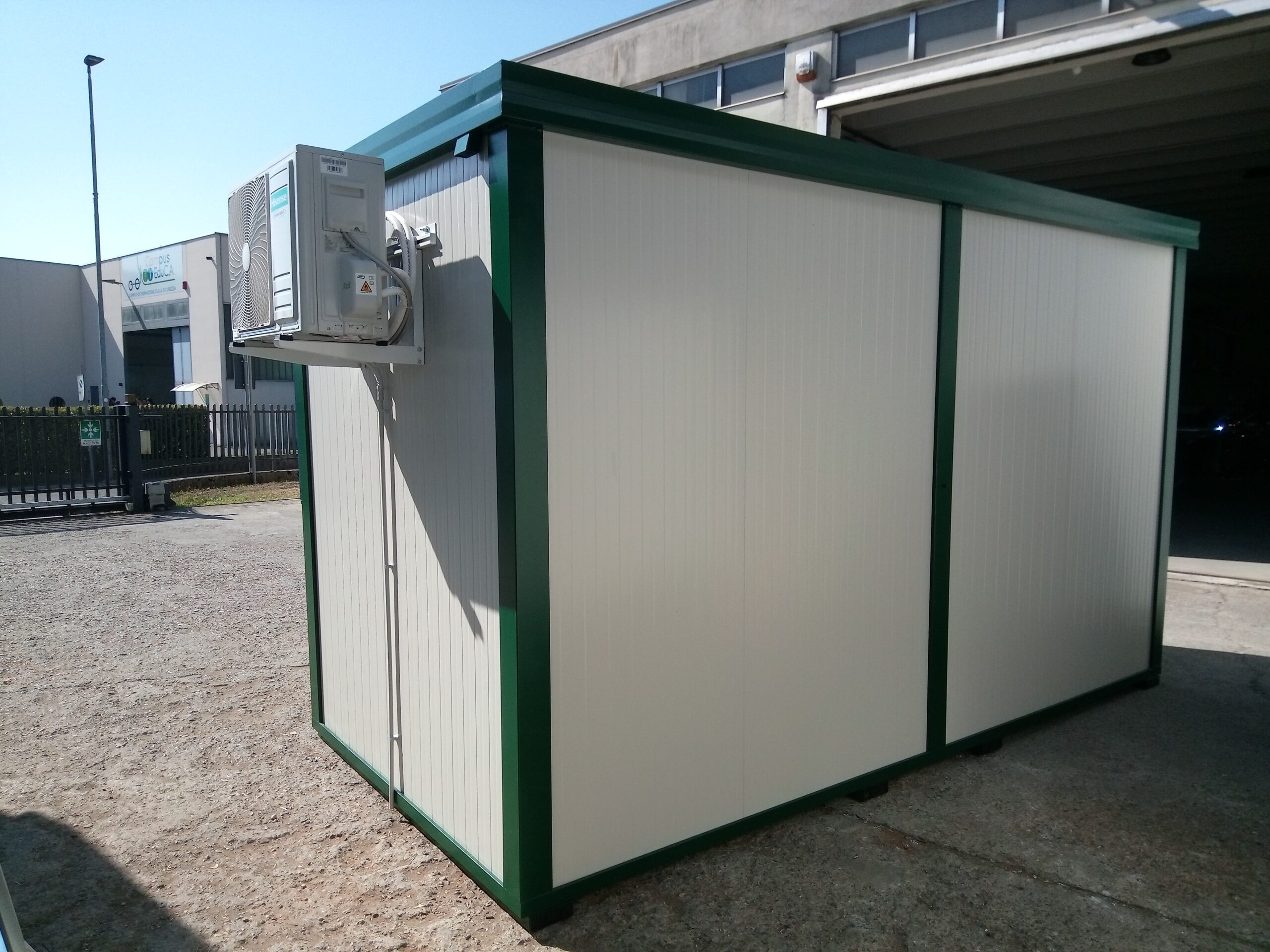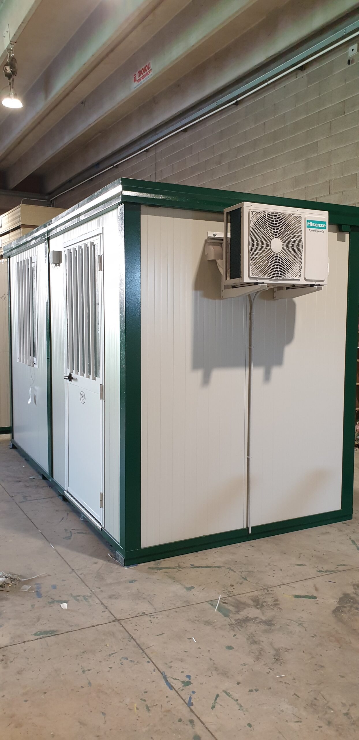 Basamento alta portanza con struttura in tubolare, rivestito con lamiera grecata, rivestita con legno IDRO V100 sp.18 mm, rivestito con PVC Standard.