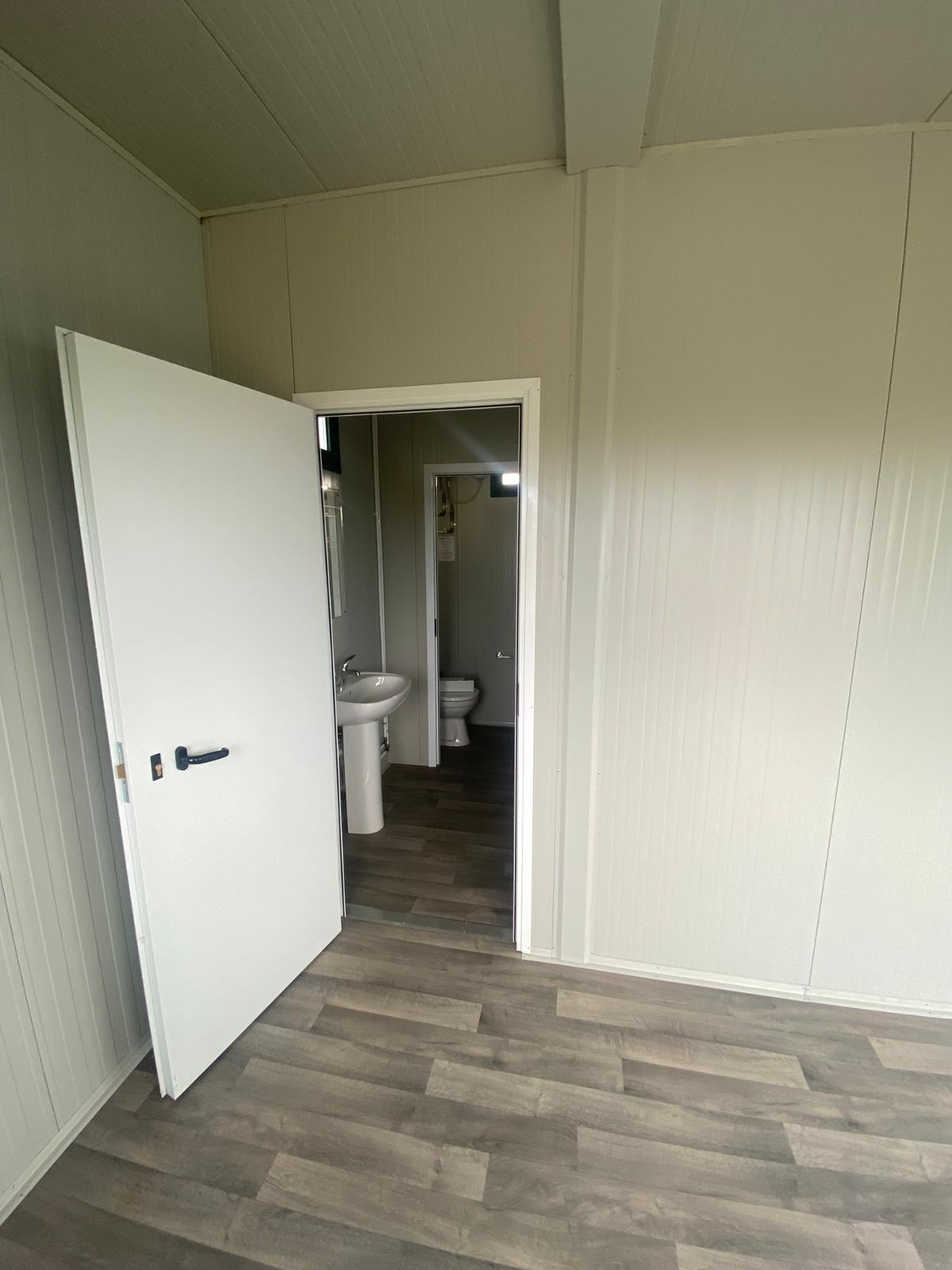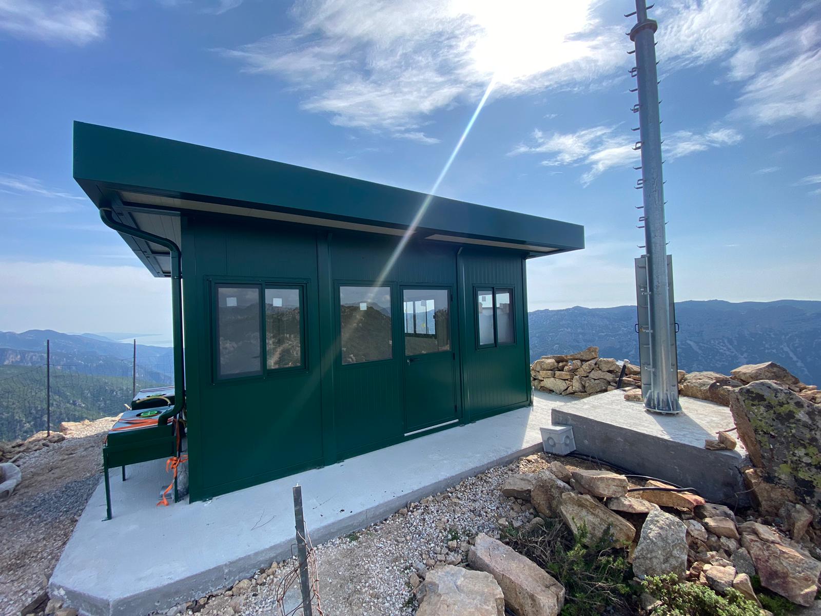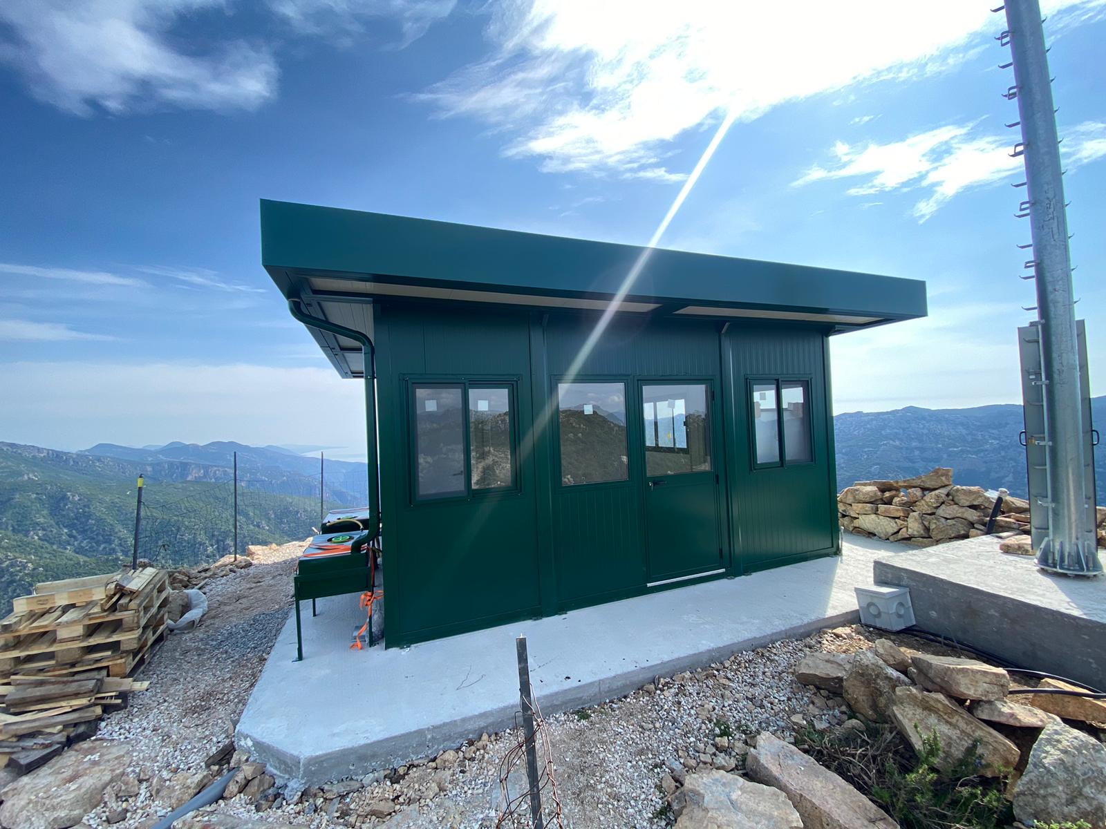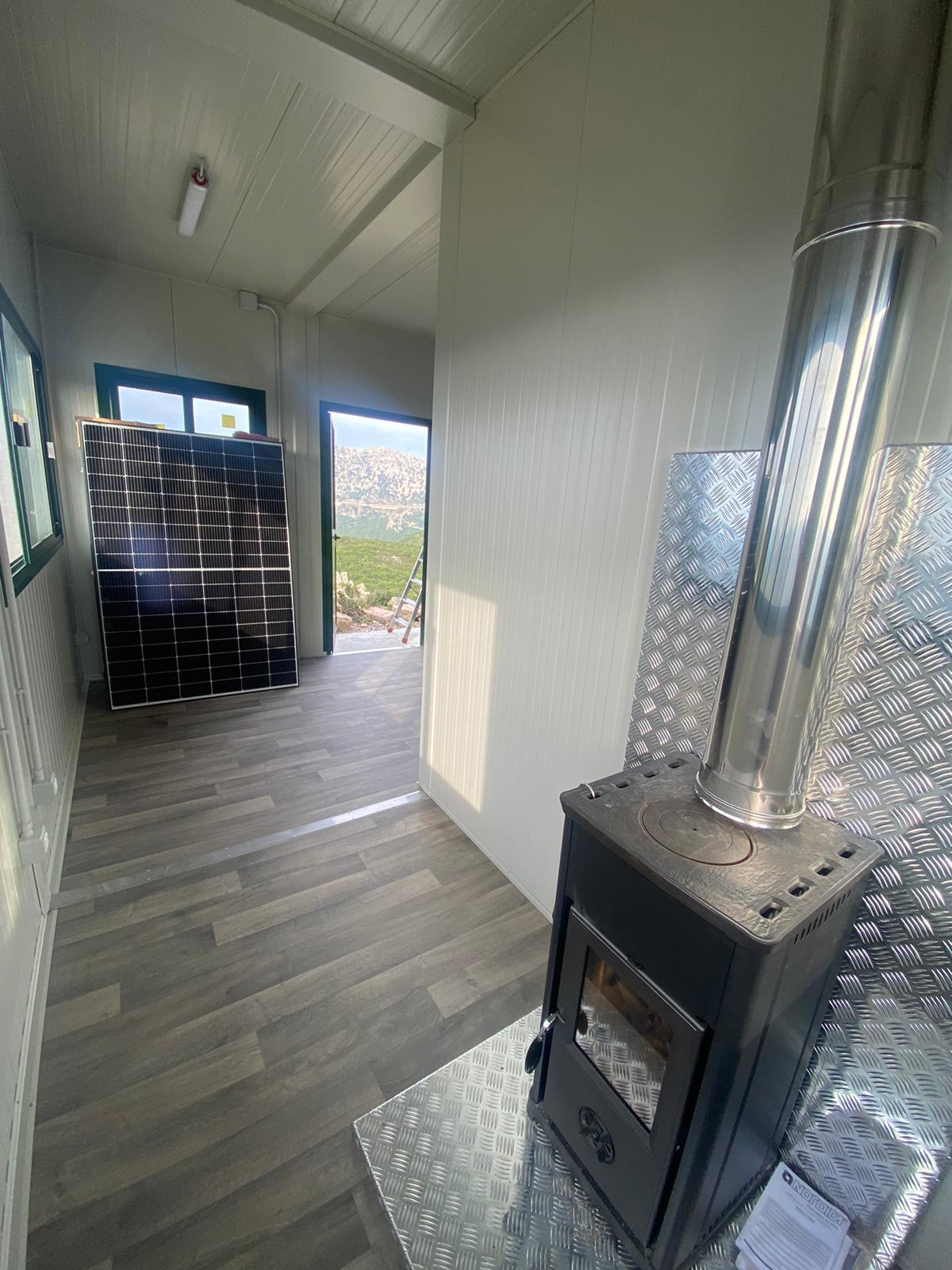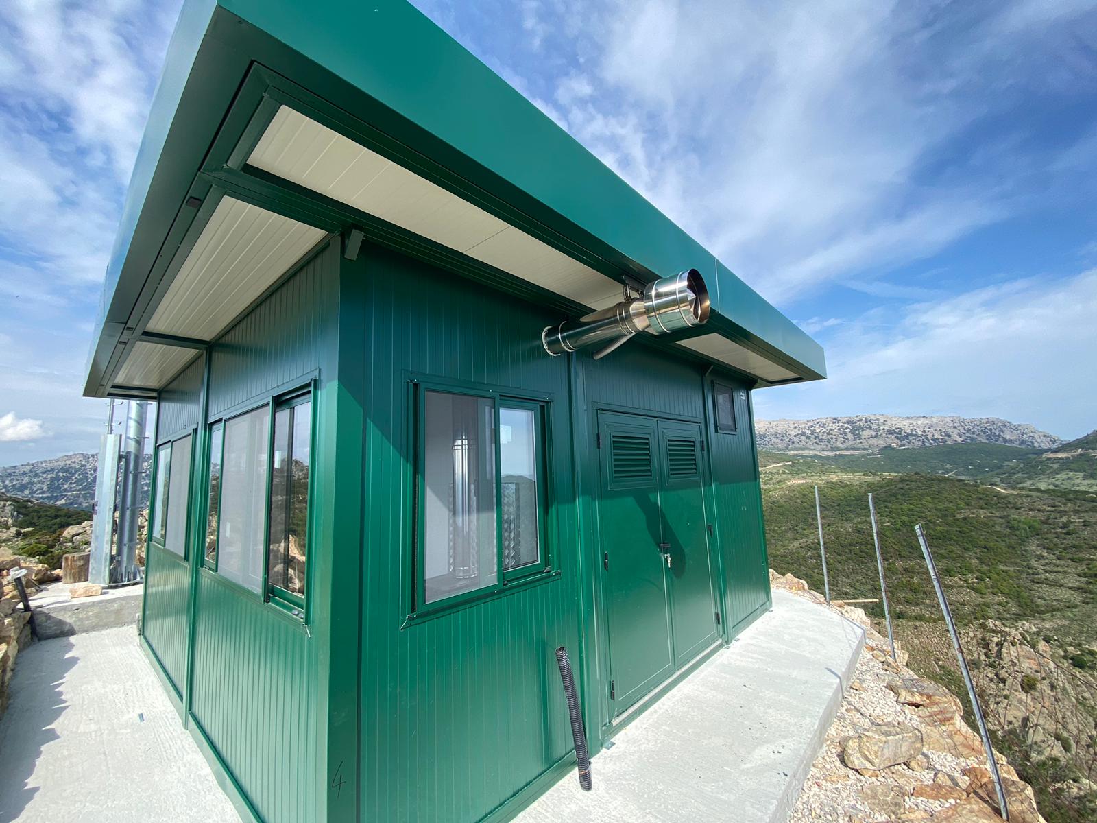 Basamento alta portanza con struttura in tubolare, rivestito con lamiera grecata, rivestito con legno IDRO V100 sp.18 mm, rivestito con PVC Finto Legno colore GRIGIO.