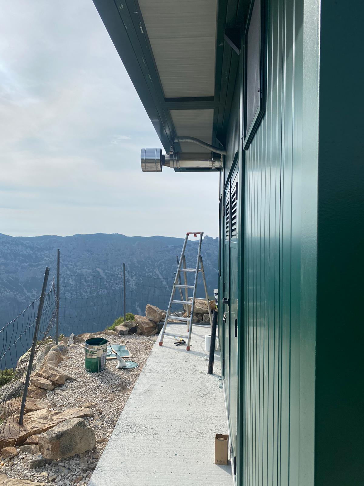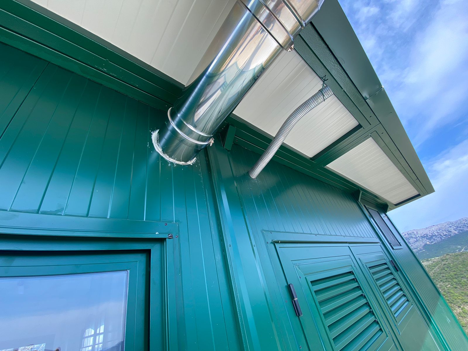 Fascione di gronda perimetrale in alluminio RAL 6005, completo di pluviali di scarico a terra.