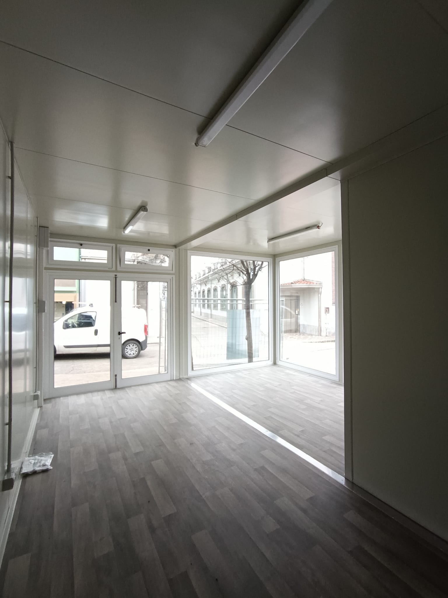 N.1 Porta tutto vetro a due ante battenti, con maniglione antipanico a 1 punto, con dimensioni 210 x 260h esterna cm, completa di Nr.2 Serramenti con apertura a vasistas.