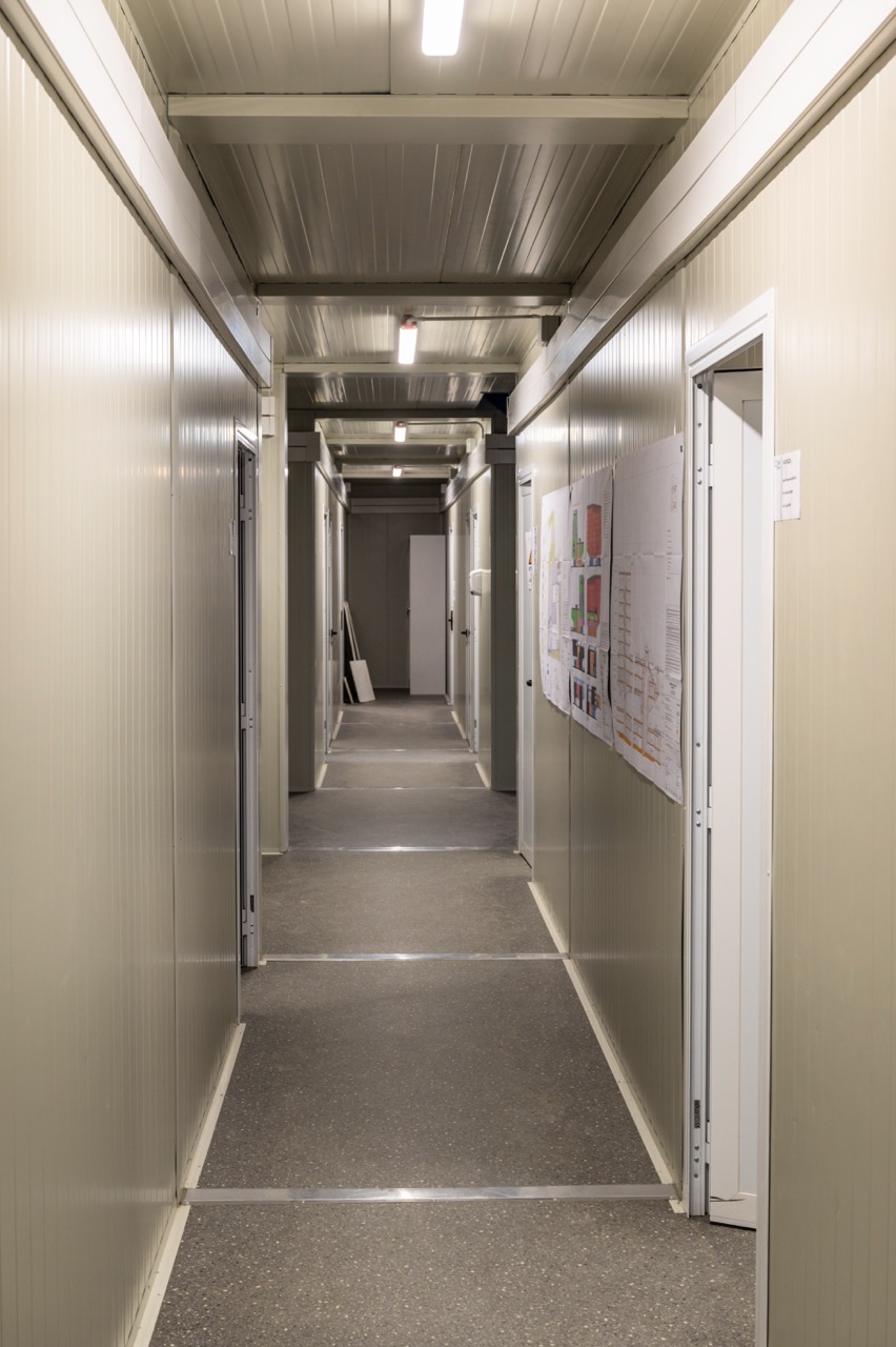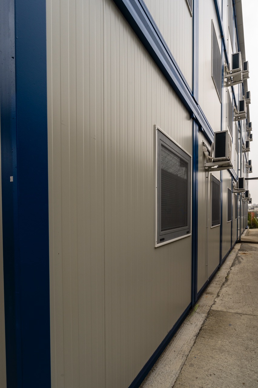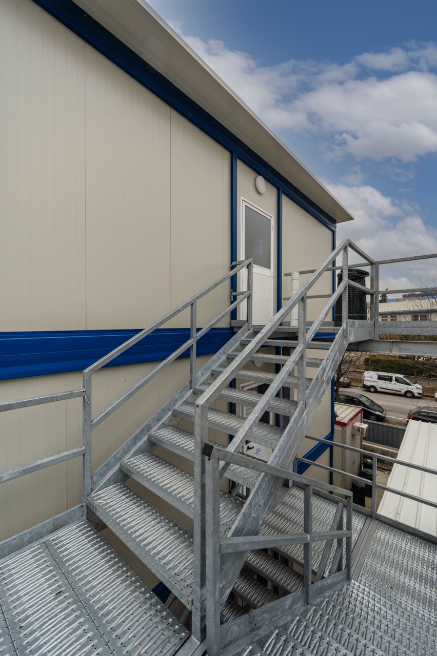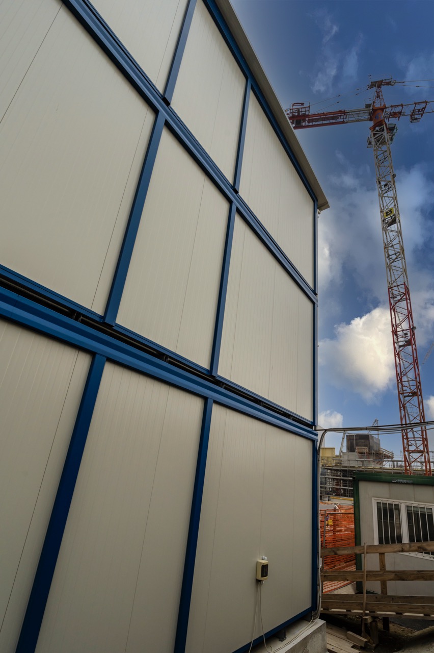 Basamento alta portanza con struttura in tubolare, rivestita con lamiera grecata, rivestite con Pannello PARETE sp.40 mm – Poliuretano, rivestito con legno IDRO V100 sp.18 mm, rivestito con PVC Standard.