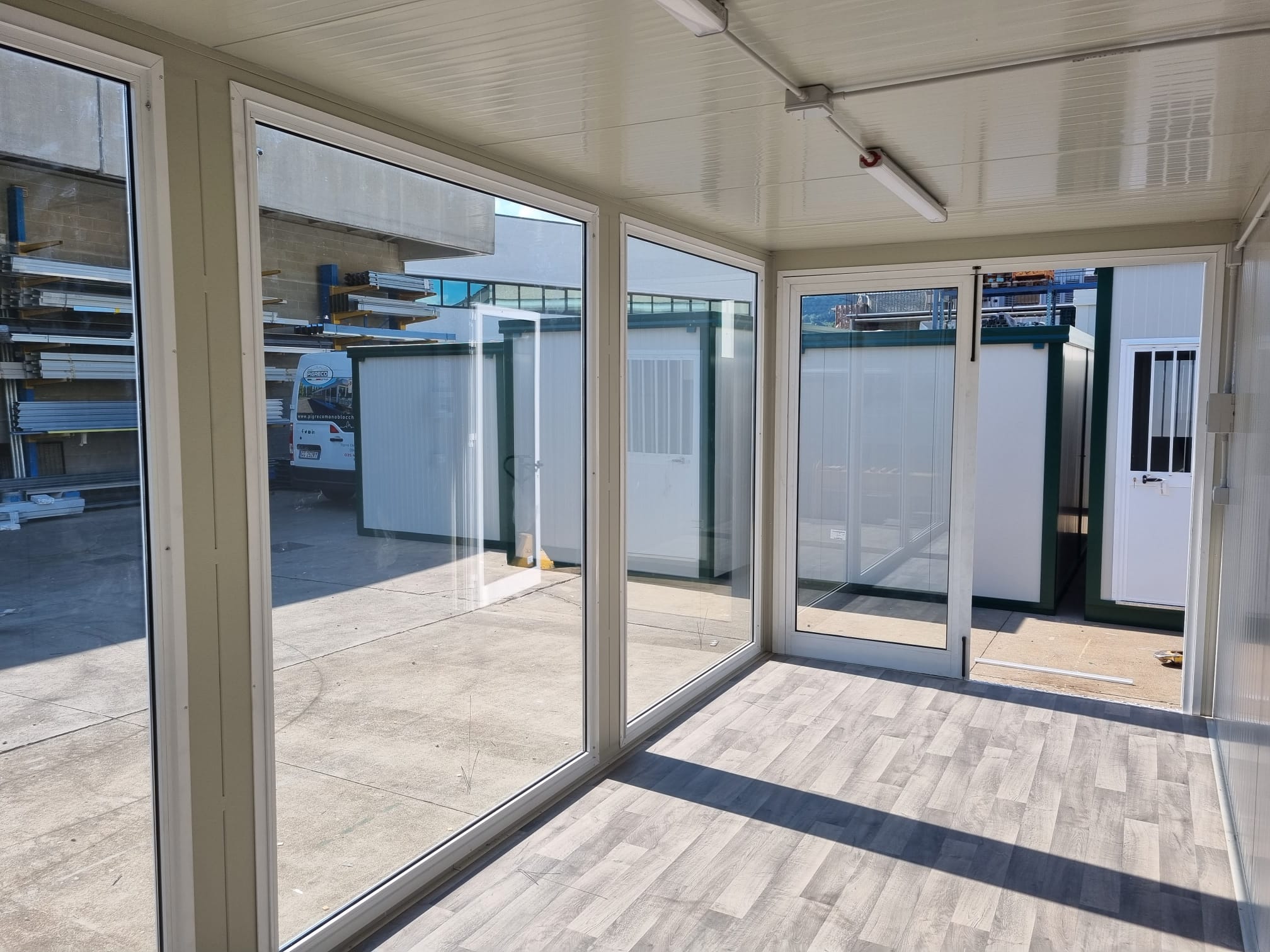 Basamento alta portanza con struttura in tubolare zincato, rivestita con lamiere grecate zincate, rivestito con legno Idro V100 sp.18 mm, rivestito con PVC Standard.