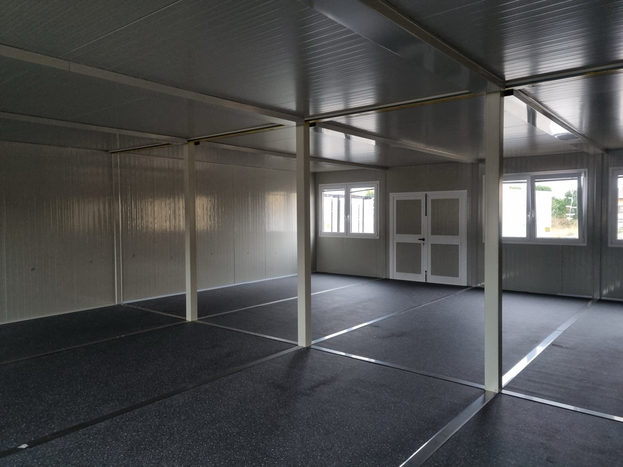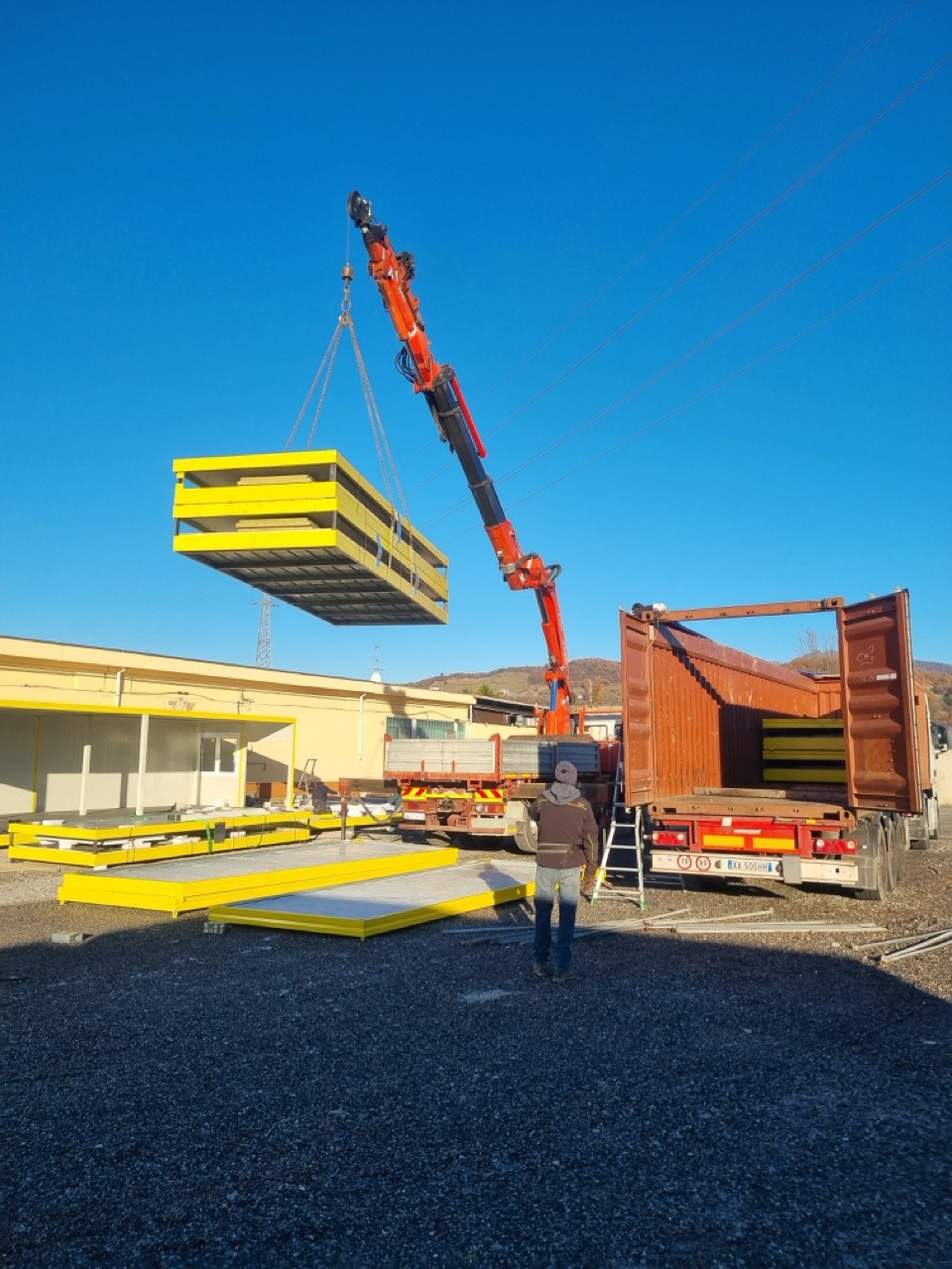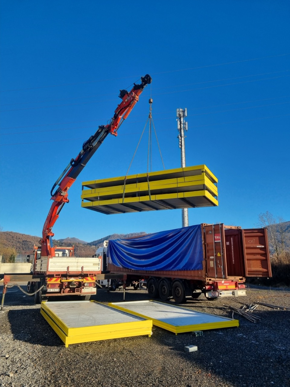 Basamento alta portanza con struttura in tubolare, rivestito con Pannello Parete sp.80 mm – Lana Minerale EI60, rivestito con lamiera grecata, rivestita con legno cemento sp.16 mm, rivestito con PVCStandard.
