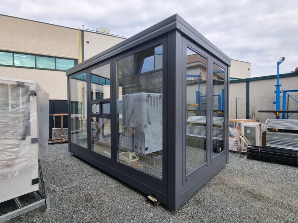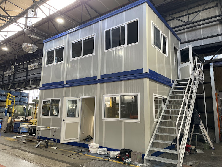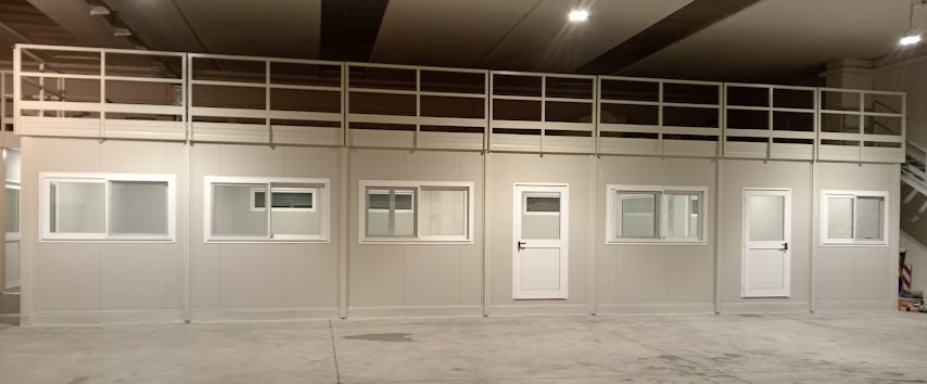 Descrizione Ufficio su 2 Piani Insonorizzato con struttura presso piegata sp.15/10 mm, saldata in continuo colore RAL 5002 (Profilo Tetto