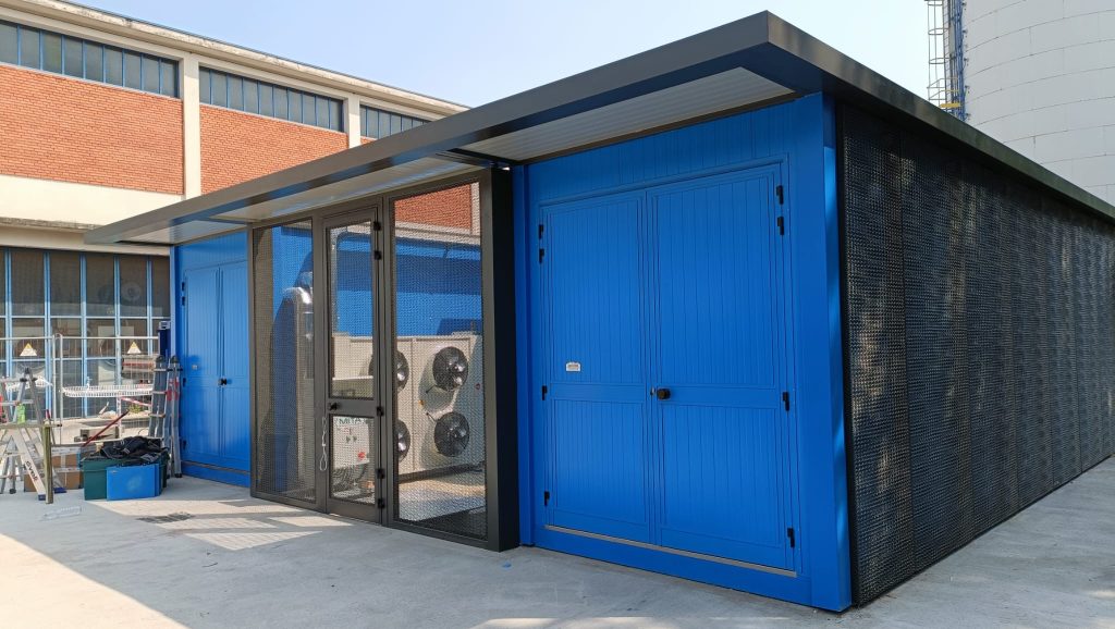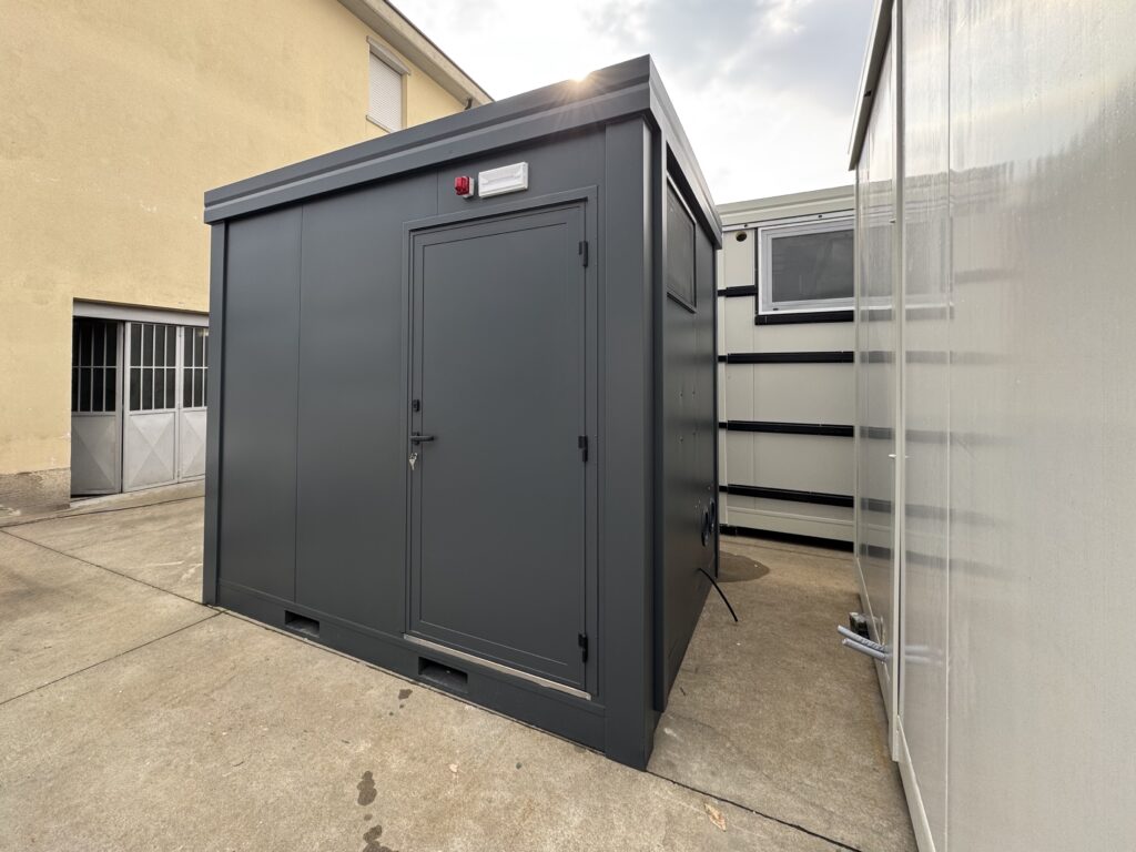 Descrizione Monoblocco 250 x 250 cm adatto come bagno. Struttura presso piegata sp.15/10mm, saldata in continuo colore RAL6005, Fondo Finire