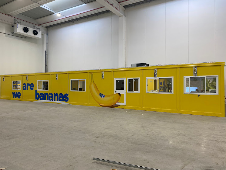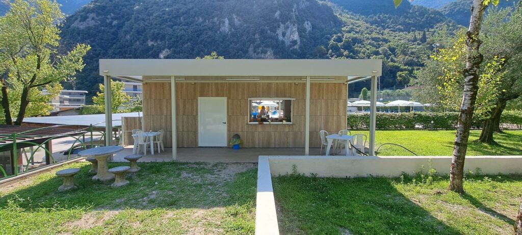 Descrizione Monoblocco 520 x 275 cm personalizzato per utilizzo come Portineria. Struttura presso piegata sp.30/10 mm, saldata in continuo colore
